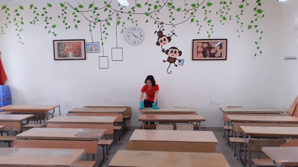 Ban giám hiệu nhà trường đã huy động toàn thể cán bộ, nhân viên, giáo viên và phụ huynh học sinh cùng tham gia thực hiện. Các khu vực trong khuôn viên nhà trường như: lớp học, cầu thang, hành lang, khu vực bếp ăn, công trình vệ sinh và các khu vực ngoại cảnh, sân chơi được quét dọn, vệ sinh sạch sẽ; các vị trí như: nền nhà, bàn, ghế, bảng viết, cửa sổ, cửa ra vào, tay nắm cửa, tay vịn cầu thang, được tổng vệ sinh, lau chùi sạch sẽ trước khi lau khử khuẩn bằng dung dịch chloramine B; một số loại học cụ được ngâm khử khuẩn bằng dung dịch cloramine B hoặc chất tẩy rửa thông thường đặc biệt là những vật dụng tiếp xúc trực tiếp, thường xuyên với học sinh.